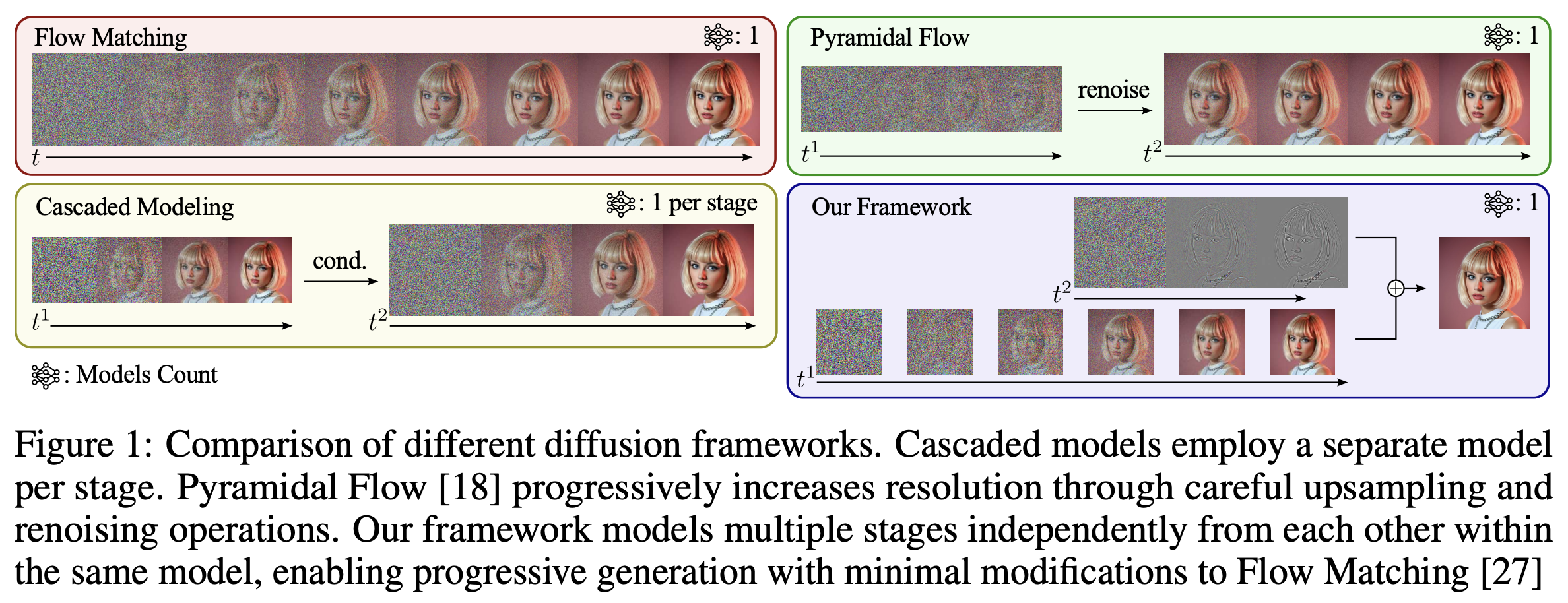 Generating high-dimensional visual modalities is a computationally intensive task. A common solution is progressive generation, where the outputs are synthesized in a coarse-to-fine spectral autoregressive manner. While diffusion models benefit from the coarse-to-fine nature of denoising, explicit multi-stage architectures are rarely adopted. These architectures have increased the complexity of the overall approach, introducing the need for a custom diffusion formulation, decomposition-dependent stage transitions, add-hoc samplers, or a model cascade. Our contribution, Decomposable Flow Matching (DFM), is a simple and effective framework for the progressive generation of visual media. DFM applies Flow Matching independently at each level of a user-defined multi-scale representation (such as Laplacian pyramid). As shown by our experiments, our approach improves visual quality for both images and videos, featuring superior results compared to prior multistage frameworks. On Imagenet-1k 512px, DFM achieves 35.2% improvements in FDD scores over the base architecture and 26.4% over the best-performing baseline, under the same training compute. When applied to finetuning of large models, such as FLUX, DFM shows faster convergence speed to the training distribution. Crucially, all these advantages are achieved with a single model, architectural simplicity, and minimal modifications to existing training pipelines.
